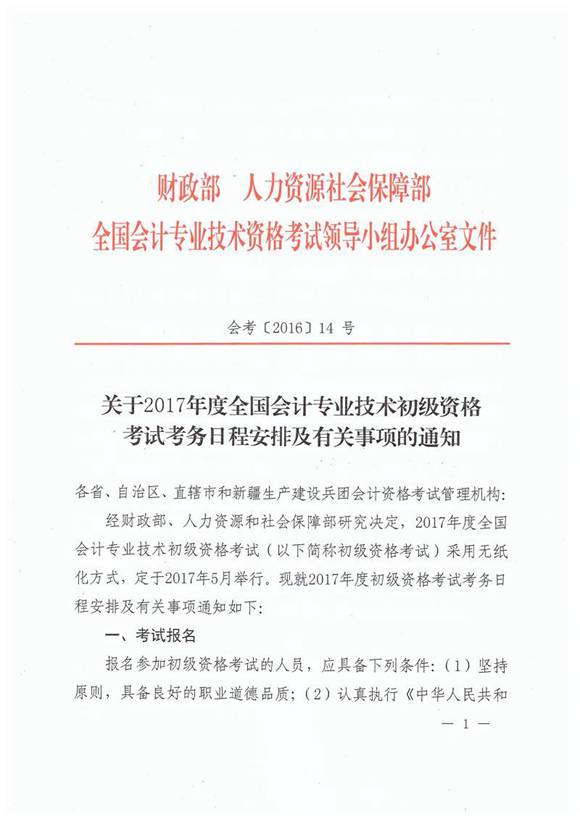 2017年北京会计初级职称考试2016年11月网上报考2017年5月13-18日考试!