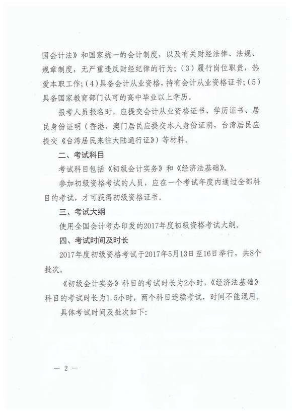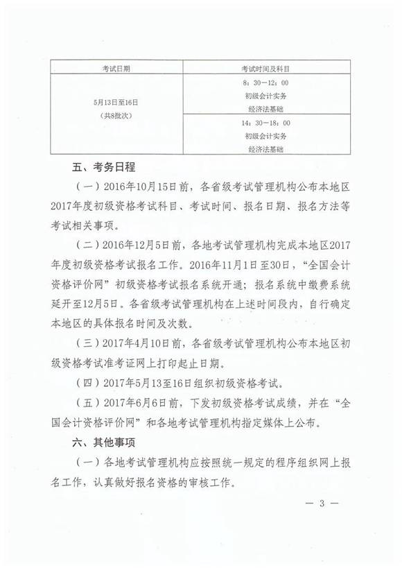 2017年北京会计初级职称考试日程安排